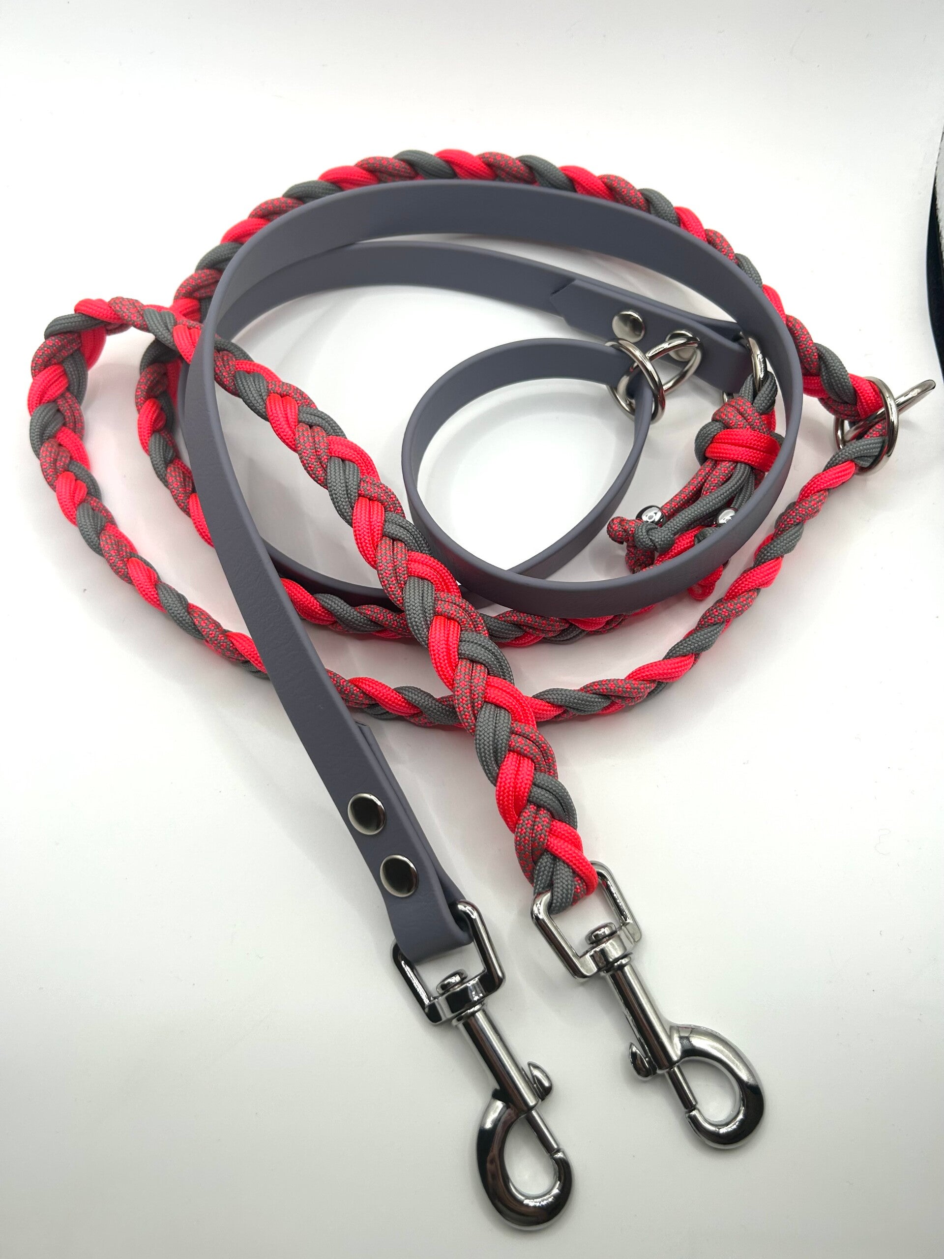 - 50/50 Leine, ein Teil besteht aus Biothane, ein Teil aus Paracord geflochten